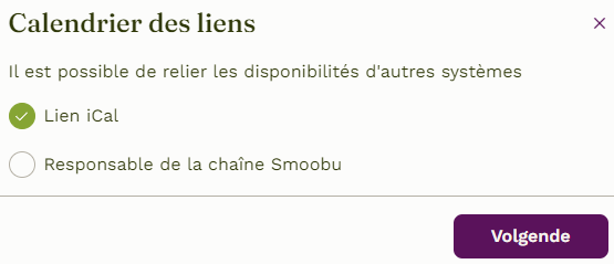 3. L'écran ci-dessous apparaît. Sélectionnez 'Lien iCal' et cliquez sur Suivant.