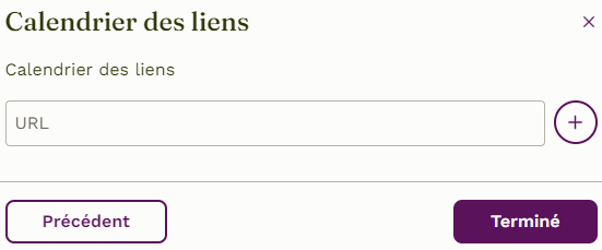 4. Saisissez le lien iCal d'une autre plateforme ici, puis cliquez sur le signe plus pour ajouter le lien. Si vous avez fait cela et que vous voulez ajouter une autre plateforme, vous pouvez entrer ce lien iCal dans la barre URL vide. Ensuite, répétez les étapes (cliquez sur le signe plus). Lorsque vous avez saisi toutes les plateformes, cliquez sur Terminé.
