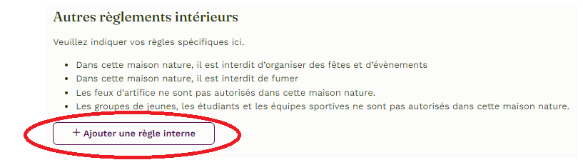 Si vous avez des règles supplémentaires pour votre maison de la nature, vous pouvez ajouter celles que vous souhaitez en cliquant sur le bouton "+ Ajouter une règle interne".